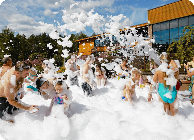 Most think foam is made from soap and water, making you get cold, wet, and sticky. Wrong! Yes, your clothes will get damp, but you will not feel cold when you are in the foam, it will keep you warm. Our foam is 100% Naturally Organic making it 100% safe for all, including the planet. Our foam solution is odor free, and has no chemicals, Sulfates or petrol ingredients. Fun and Safety will always be our priority.